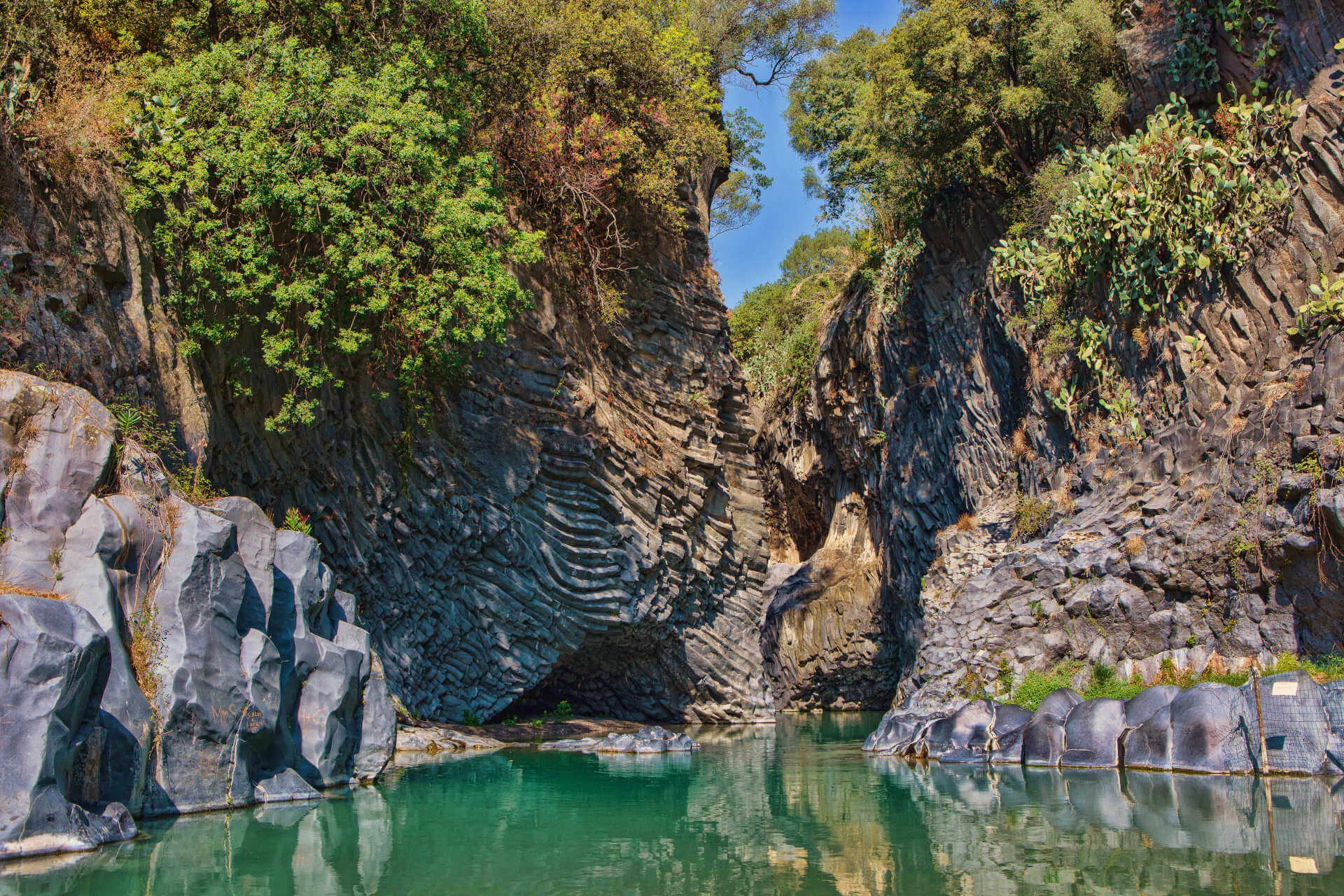 The Alcantara Gorges, located in the valley of the Alcantara River, are one of the most spectacular geological phenomena in eastern Sicily. These impressive rock formations were created by the erosion of the river's waters on basaltic lava flows originating from Mount Etna. The result is a majestic canyon, with walls rising for tens of metres, creating an almost lunar landscape accentuated by the contrast between the glossy black rock and the lush greenery of the surrounding vegetation.